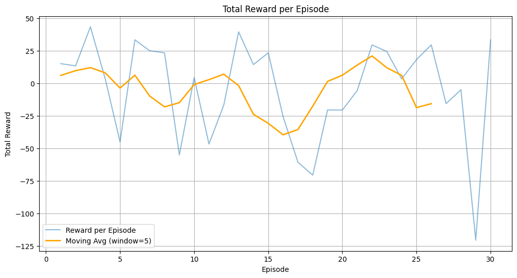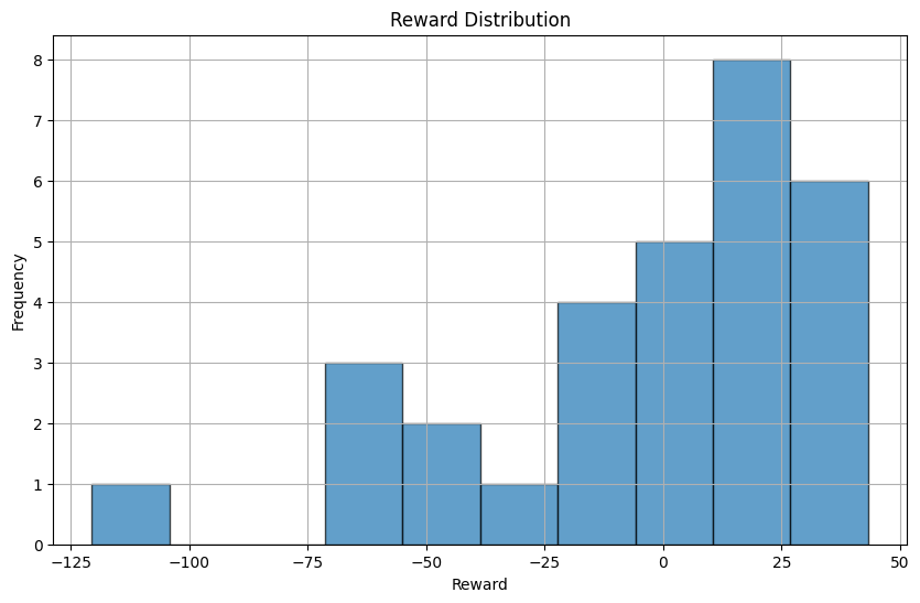 The key findings from the experiments are improvements in total reward, reduction in total distance, elimination of node revisits, and reward distribution. First, the agent’s performance improved significantly over time. Starting with an average reward of -50, the model achieved a peak reward of 43.3 in optimized routes. Additionally, the total distance was reduced: the initial random route had a total travel distance of 200 units, yet after training, the optimized routes reduced the distance to 127 units. In regard to node revisits, initially, the agent revisited nodes multiple times, leading to inefficiencies. However, after training, the model learned to visit each node only once, avoiding redundant trips and reducing unnecessary penalties. Overall, the rewards per episode showed steady improvement as the model learned optimal policies. The reward distribution indicates a positive skew, with high-performing episodes achieving rewards above 30.