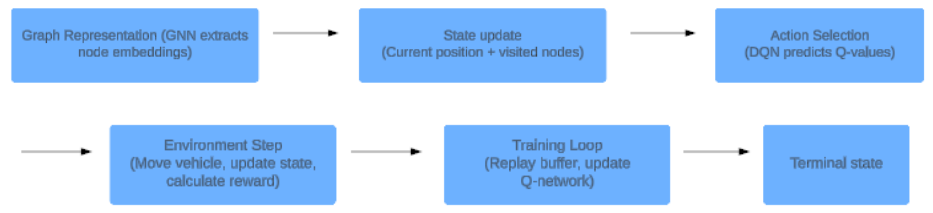 The experiment was conducted using a custom Gym environment to simulate garbage collection routing. The environment was modeled as a graph, where nodes represent waste collection points, and edges represent the roads between them. Each edge was assigned a weight corresponding to the travel time or distance. The state includes a one-hot encoded current position of the vehicle and a binary vector indicating visited nodes. A negative reward was assigned for distance traveled and revisiting nodes, while a positive reward was granted for successfully visiting all nodes, as mentioned above. The training parameters for GNN-DQN are 1) episodes: 1000, 2) batch size: 64, 3) discount factor: 0.99, 4) learning rate: 0.001, and 5) Epsilon decay: 0.995 with a minimum value of 0.1. For evaluation metrics, the total reward, total distance traveled, and number of revisits were measured.